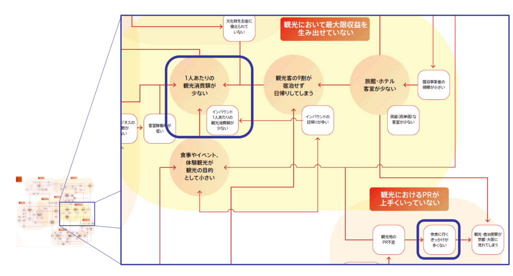 同社が解決に取り組むやまと地域の主な社会課題は、奈良県の観光における「奈良に行くきっかけがない」「1人あたりの観光消費額が少ない」という点です。