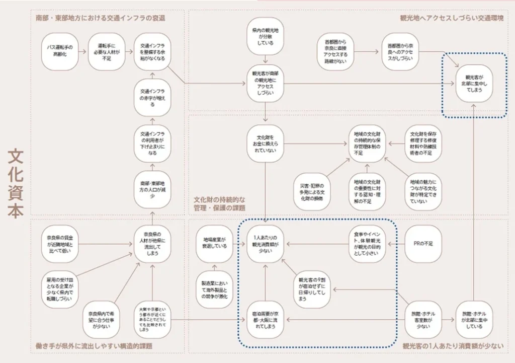 やまと地域における文化資本領域の1つである観光に関する課題として、観光客の地域での滞在時間が短いために観光消費が低迷していることのほか、観光客の訪問先が同地域の北部に集中してしまっているということが挙げられます。