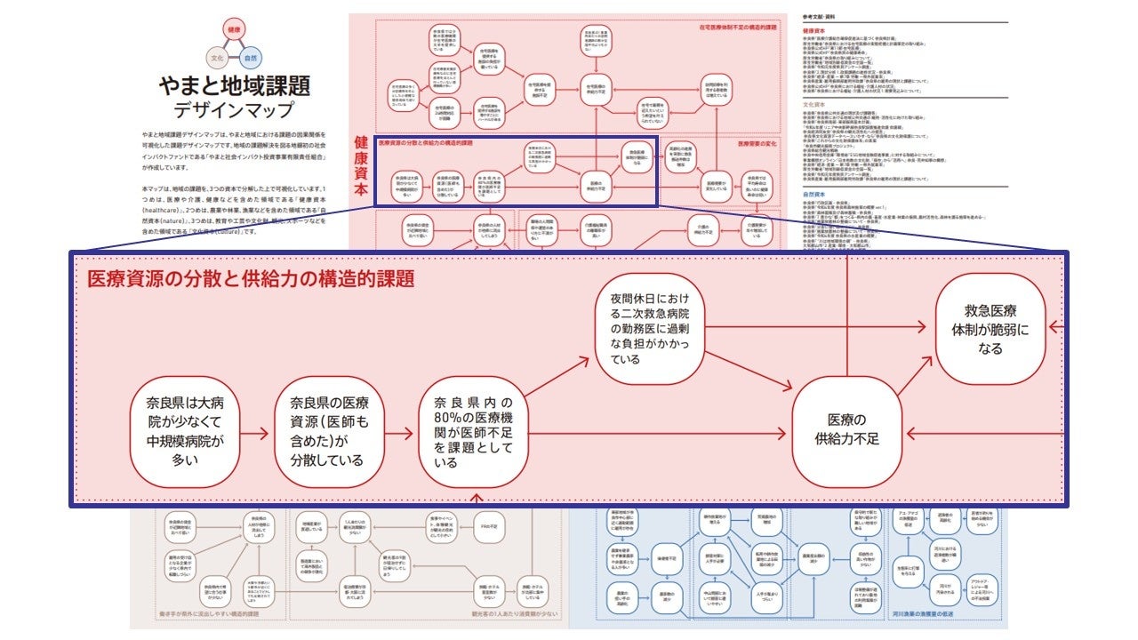 やまと社会インパクトファンドでは、やまと地域の課題を可視化した「やまと地域課題デザインマップ」を作成しています。やまと地域課題デザインマップにおいて、AMI株式会社が解決する課題領域は線で囲んだ部分です。